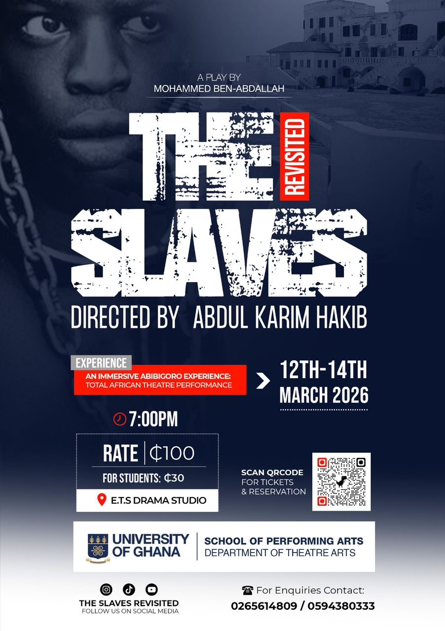 The School of Performing Arts, University of Ghana, presents The Slaves Revisited, a gripping play by Mohammed Ben-Abdallah, directed by Dr. Abdul Karim Hakib, Theatre Arts Department. This immersive theatrical experience brings history, identity, and human struggle to life through compelling storytelling and dynamic performance.